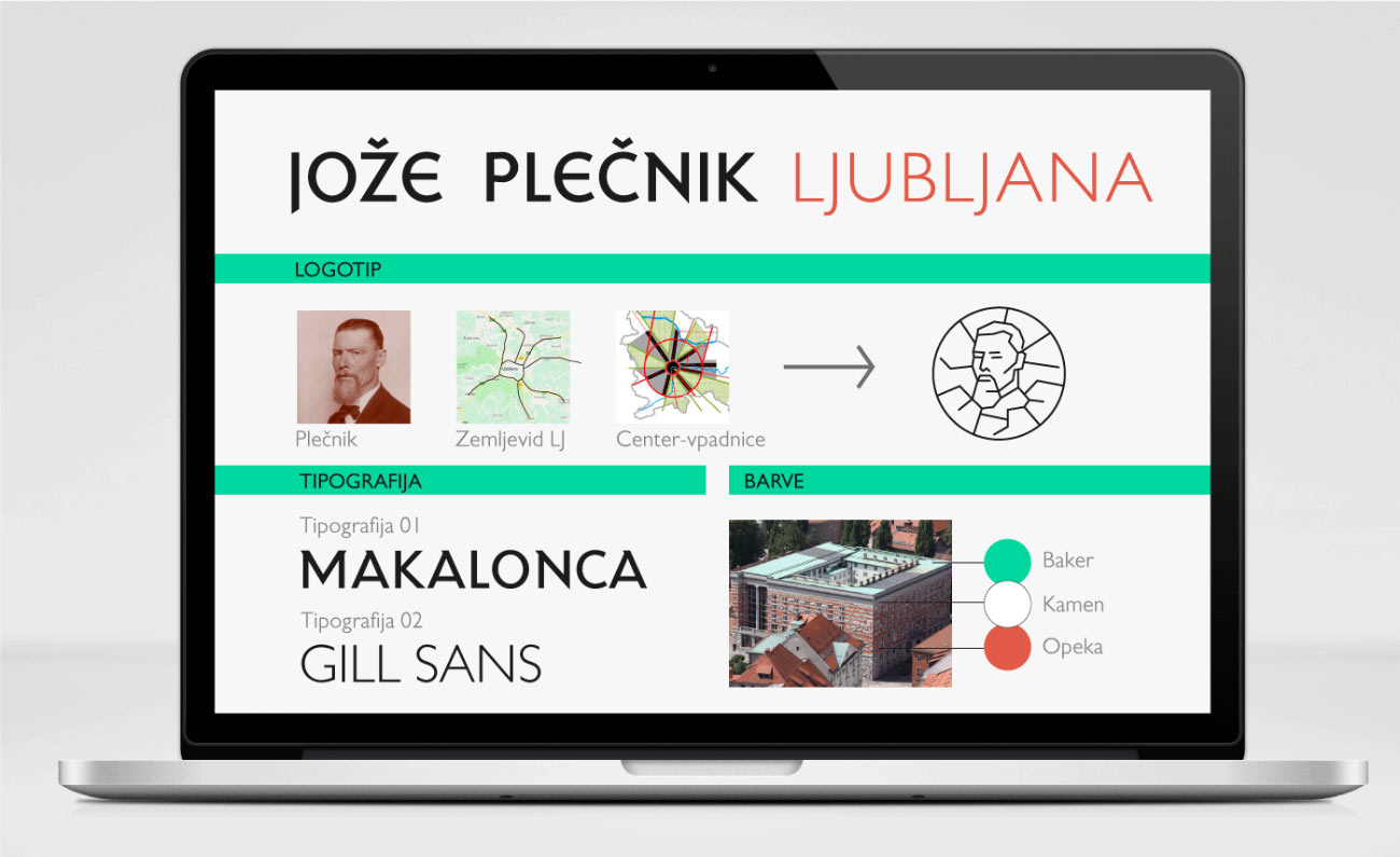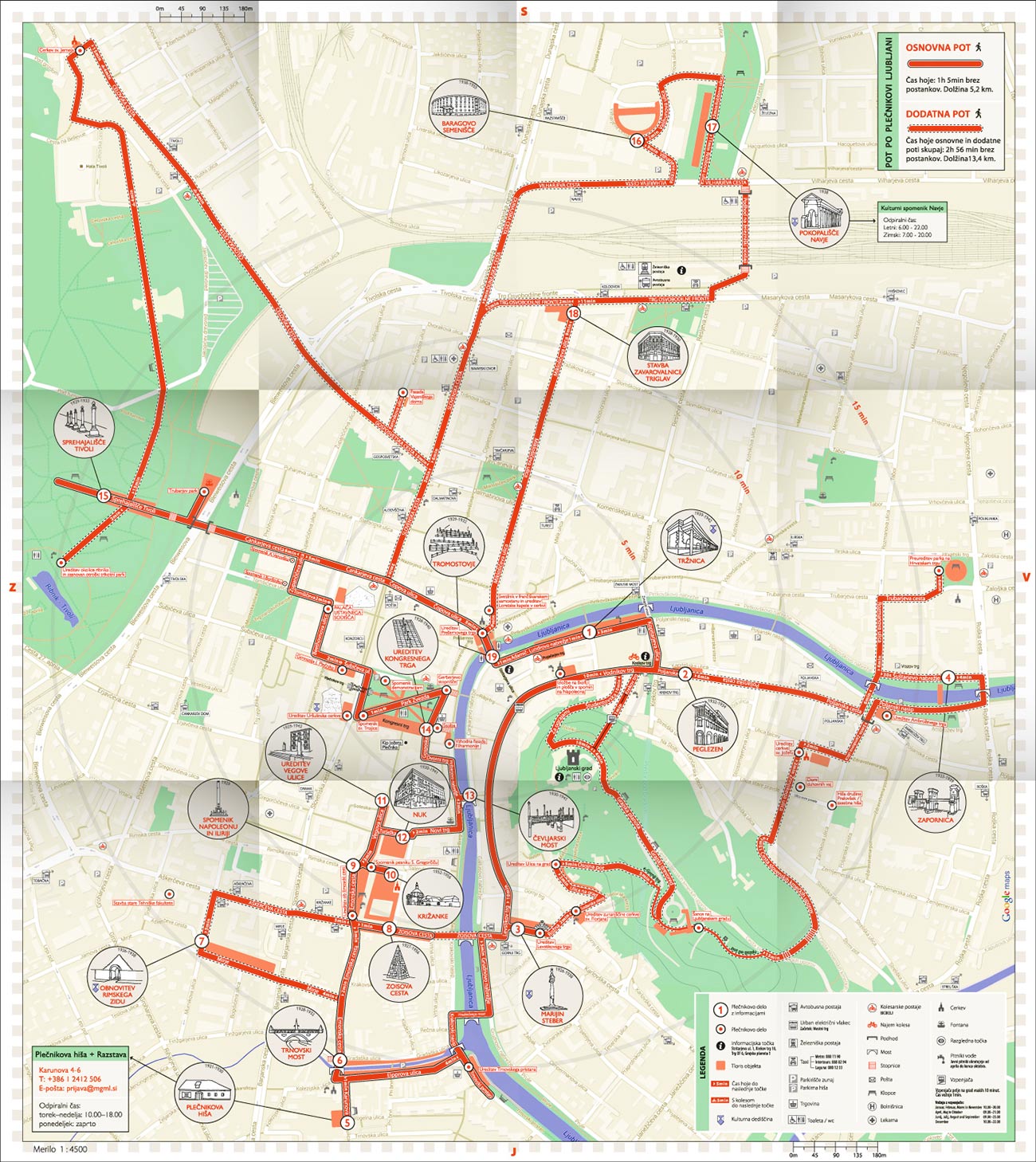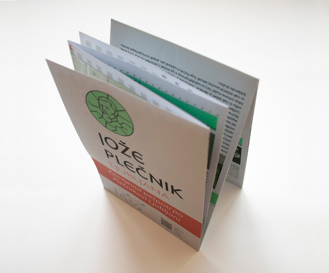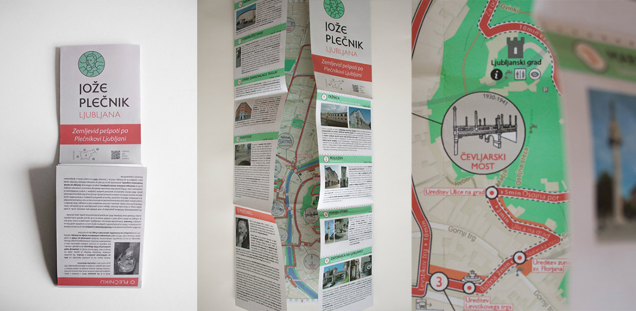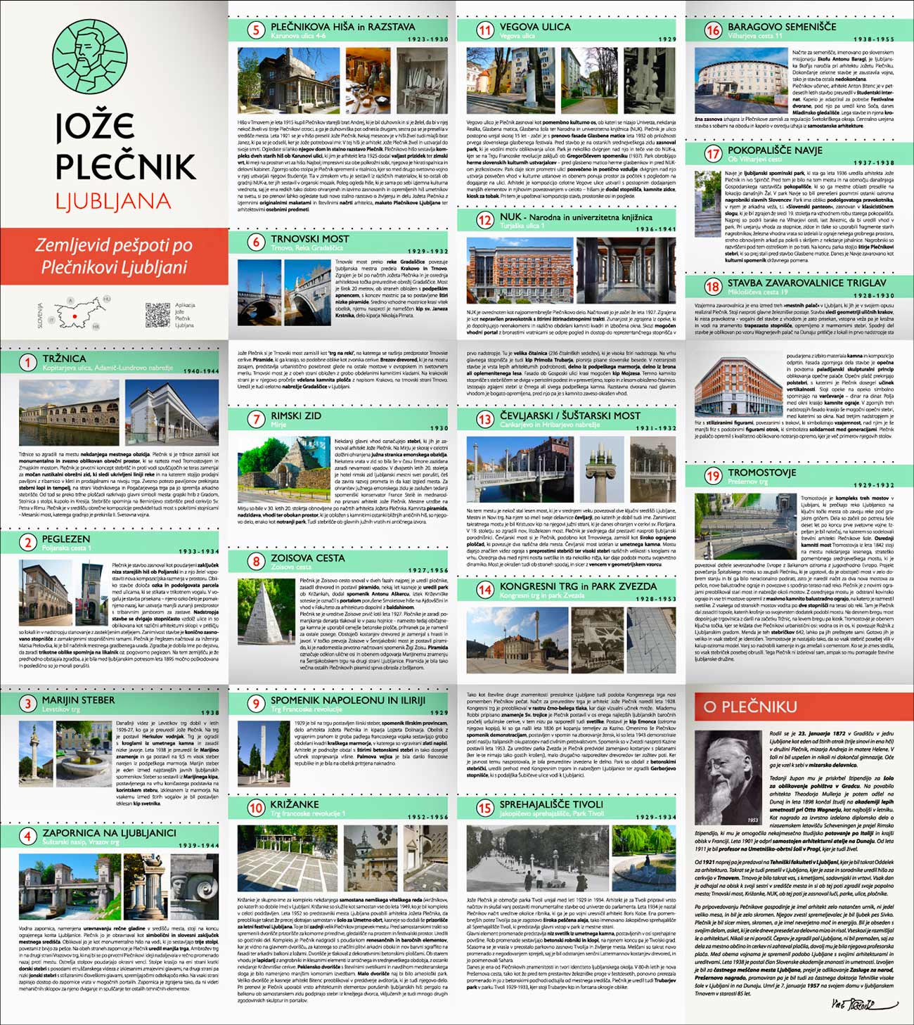 Celostna grafična podoba Plečnikove Ljubljane in zemljevid poti po Plečnikovi Ljubljani. Na zgibanem zemljevidu so predstavljene poti in Plečnikova večja in manjša arhitekturna dela, ki jih je samo v centru Ljubljane okoli 45. Na hrbtni strani zemljevida so opisi večjih Plečnikovih del in opremljeni s slikovnim gradivom.