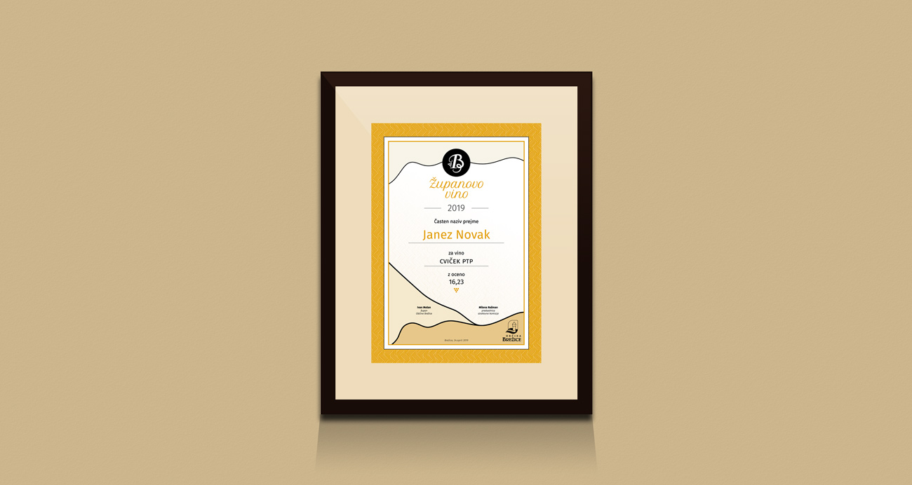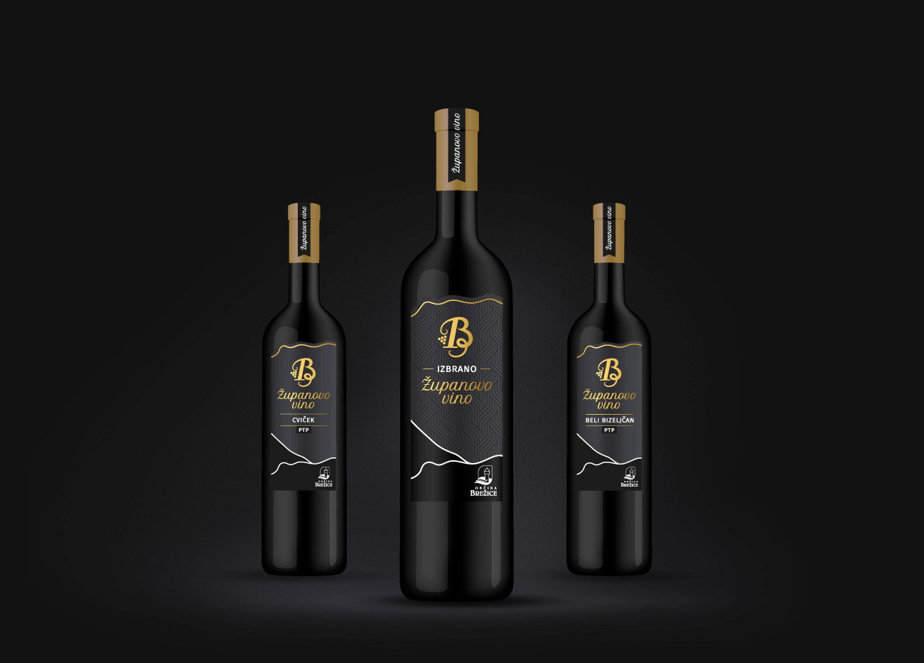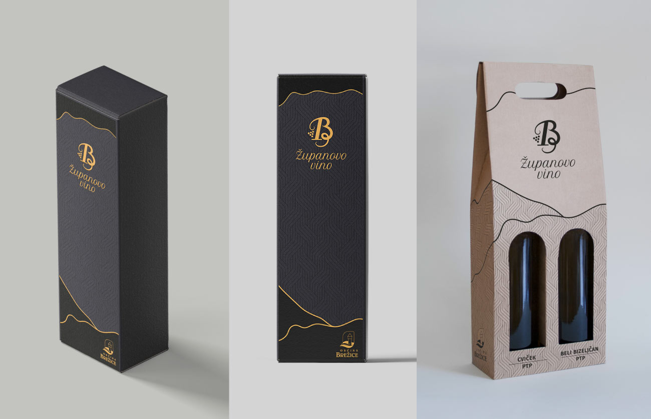 Celostna grafična podoba za izbor Županovega vina Brežice. Namen podobe je promocija vin in vinarjev v občini Brežice. Oblikovane so etikete za 3 različna vina- cviček, beli bizeljčan in izbrano vino, ter prestižna embalaža in embalaža za dve steklenici. Podoba je elegantna in prestižna.